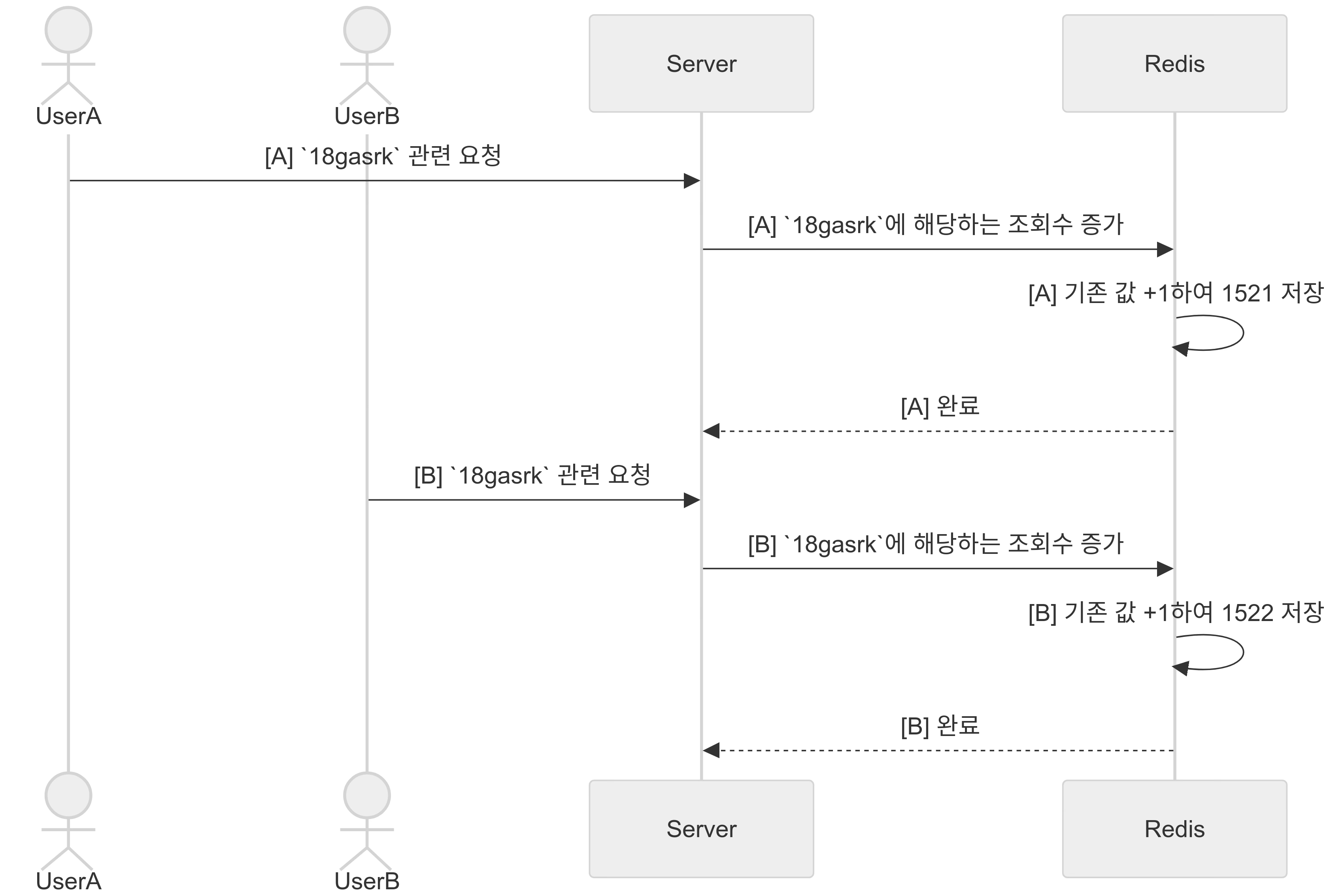 위처럼 두 사용자가 동시에 같은 key 값으로 요청을 전송한 경우 업데이트 값이 반영이 되지 않는 lost update가 발생하는 것이다.