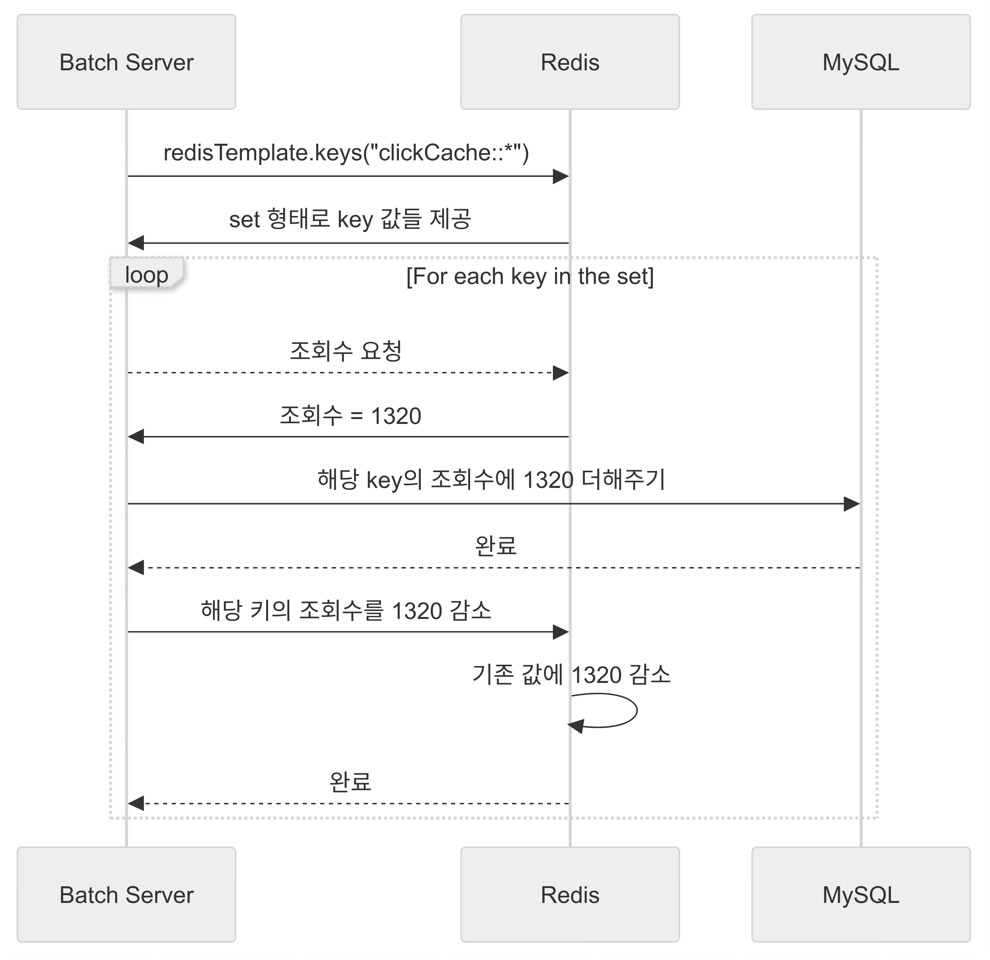 - 스프링에서 스케쥴링을 통해서 레디스의 clickCache:*를 가져와서, 각 key 별로 조회수를 집계한다.
